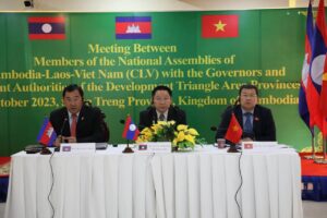 នៅសណ្ឋាគារអង្គរមាស ខេត្តស្ទឹងត្រែង នាព្រឹកថ្ងៃទី១៩ ខែតុលា ឆ្នាំ២០២៣ គណៈប្រតិភូរដ្ឋសភាកម្ពុជា-ឡាវ- វៀត ណាម (CLV) បានស្ដាប់របាយការណ៍និងពិភាក្សាជាមួយអភិបាលខេត្តទាំង៤ ក្នុងតំបន់ត្រីកោណអភិវឌ្ឍន៍ជាប់ព្រំដែនវៀតណាម មានខេត្តស្ទឹងត្រែង ខេត្តរតនគិរី ខេត្តមណ្ឌលគិរី និងខេត្តក្រចេះ។