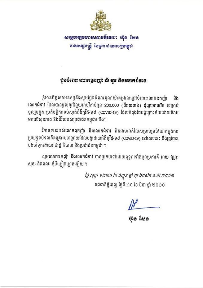 (ភ្នំពេញ)៖ នាព្រឹកថ្ងៃទី២០ ខែមីនា ឆ្នាំ២០២០នេះ សម្តេចអគ្គមហាសេនាបតីតេជោ ហ៊ុន សែន បានផ្ញើលិខិតថ្លែងអំណរគុណចំពោះ ឯកឧត្តមឧបនាយករដ្ឋមន្ត្រី ហោ ណាំហុង និងលោកជំទាវ ដែលចូលរួមបរិច្ចាគទឹកប្រាក់ចំនួន ១០.០០០(មួយម៉ឺន) ដុល្លារអាមេរិក ក្នុងការទប់ទល់នឹងសភាពការណ៍នៃជំងឺកូវីដ១៩៕