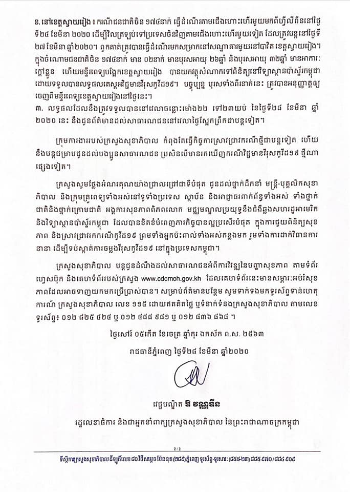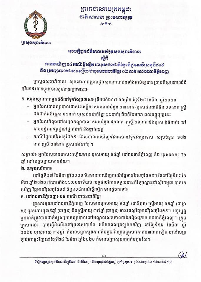 កម្ពុជារកឃើញវិជ្ជមាន ៤ ករណីបន្ថែមទៀត ធ្វើឲ្យចំនួនកើនដល់ ១០២ ករណី។ បួនករណីបន្ថែមទៀតនេះ សុទ្ធតែជាជនជាតិខ្មែរដែលទើបត្រឡប់មកពីប្រទេសបារាំង