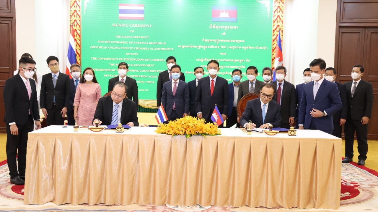 (ភ្នំពេញ)៖ កម្ពុជា និងថៃ បានចុះហត្ថលេខាលើកិច្ចព្រមព្រៀងឥណទានសម្បទានសម្រាប់គម្រោងលើកកម្រិតផ្លូវជាតិលេខ៦៧ (សៀមរាប-អន្លង់វែង-ជាំ/សាង៉ាំ) ដែលមានទឹកប្រាក់សរុបចំនួន ៩៨៣ លានបាត ត្រូវនឹងប្រមាណ ៣០ លានដុល្លារអាមេរិក នៅទីស្តីការក្រសួងសេដ្ឋកិច្ច និងហិរញ្ញវត្ថុ នាព្រឹកថ្ងៃសុក្រទី០៤ ខែវិច្ឆិកា ឆ្នាំ២០២២នេះ។ ភាគីខាងរាជរដ្ឋាភិបាលកម្ពុជា តំណាងដោយឯកឧត្តម វង្សី វិស្សុត រដ្ឋមន្រ្តីប្រតិភូអមនាយករដ្ឋមន្រ្តី និងជារដ្ឋលេខាធិការប្រចាំការ នៃក្រសួងសេដ្ឋកិច្ចនិងហិរញវត្ថុ និងភាគីខាងរាជរដ្ឋាភិ បាលថៃ តំណាងដោយឯកឧត្តម Perames Vudthitornetiraks ប្រធានទីភ្នាក់ងារសហប្រតិបត្តិការអភិវឌ្ឍន៍សេដ្ឋកិច្ចនៃបណ្តាប្រទេសជិតខាង (NEDA)។