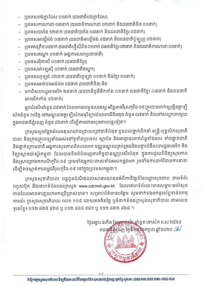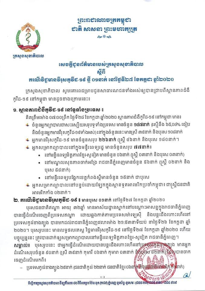 ភ្នំពេញ ៖ ក្រសួងសុខាភិបាលកម្ពុជា បានជូនដំណឹងនៅថ្ងៃទី២៧ ខែកក្កដា ឆ្នាំ២០២០ នេះថា បានរកឃើញករណីវិជ្ជមានវីរុសកូវីដ-១៩ ថ្មី មួយករណីទៀតលើអ្នកដំណើរបុរសជនជាតិឥណ្ឌា ម្នាក់ ដែលធ្វើដំណើរមកពីប្រទេសឥណ្ឌា ឆ្លងកាត់ប្រទេសម៉ាឡេស៊ី និងបន្តជើងហោះហើរទៅប្រទេសកូរ៉េខាងត្បូង រួចបន្តមកកម្ពុជា នៅថ្ងៃទី២៦ ខែកក្កដា កន្លងមកនេះ ៖