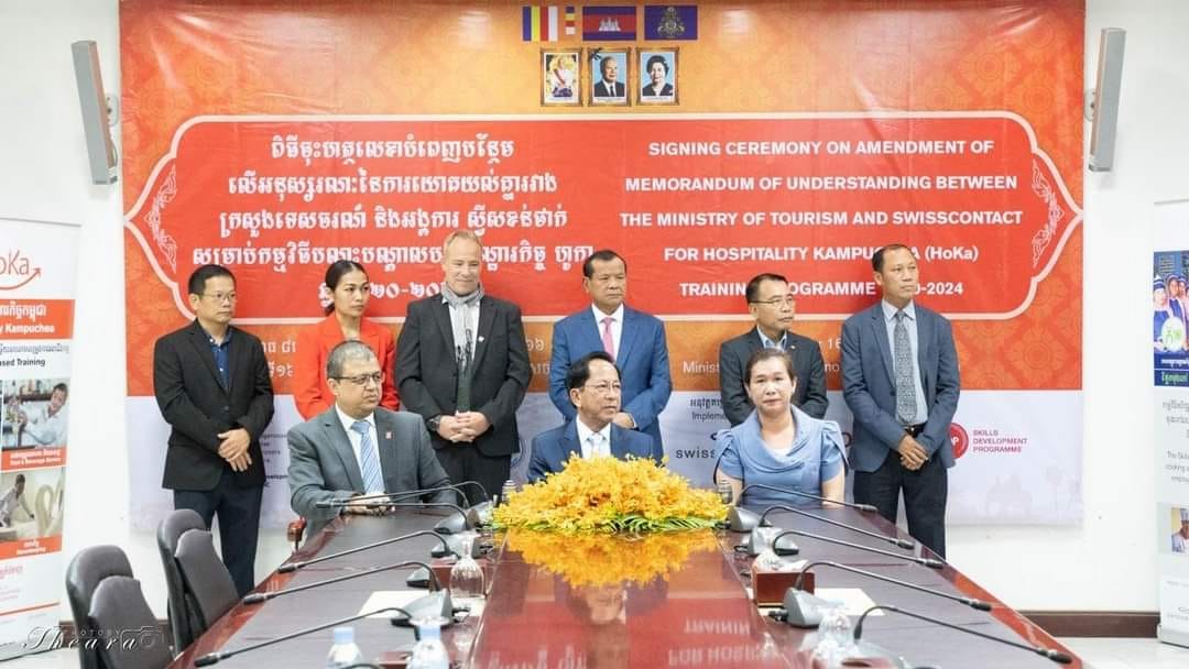ការគាំទ្រនេះធ្វើឡើងតាមរយៈកម្មវិធីបណ្តុះបណ្តាលបដិសណ្ឋារកិច្ចកម្ពុជា (HoKa) ដោយមានអនុស្សរណៈនៃការយោគយល់គ្នារវាងអង្គការស្វីសខន់ថាក់ជាមួយក្រសួង ទេសចរណ៍ ដែលមានគណៈកម្មការគ្រប់គ្រងគម្រោង ហូកា (HoKa) ជាសេនាធិការដ៏សំខាន់។