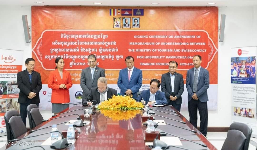 គួរជម្រាបថា ក្នុងពិធីខាងលើក៏មានបញ្ជូលកម្មវិធីចុះហត្ថ លេខាត្រីភាគីលើកិច្ចព្រមព្រៀងអនុវត្តកម្មវិធីបណ្តុះបណ្តាលបដិសណ្ឋារកិច្ចកម្ពុជា (HoKa) រវាងគណៈកម្មការគ្រប់គ្រងគម្រោង ហូកា នៃក្រសួងទេសចរណ៍ អង្គការស្វីសខន់ថាក់ និងមន្ទីរទេសចរណ៍ខេត្តគោលដៅទាំង៥ ដោយបានយក ចិត្តទុកដាក់រៀបចំនូវផែនការសកម្មភាព និងថិវការយៈពេល ៣ឆ្នាំ (២០២១-២០២៤) ដើម្បីជំរុញការបណ្តុះបណ្តាលបដិសណ្ឋារកិច្ចលើជំនាញអាទិភាពរបស់ខេត្ត រួមមាន ជំនាញការិយាល័យជួរមុខ គេហកិច្ច សេវាកម្មម្ហូបអាហារនិងភេសជ្ជៈ ចុងភៅ ជំនាញឆុងកាហ្វេ និងមគ្គុទ្ទេសសហគមន៍ផងដែរ។