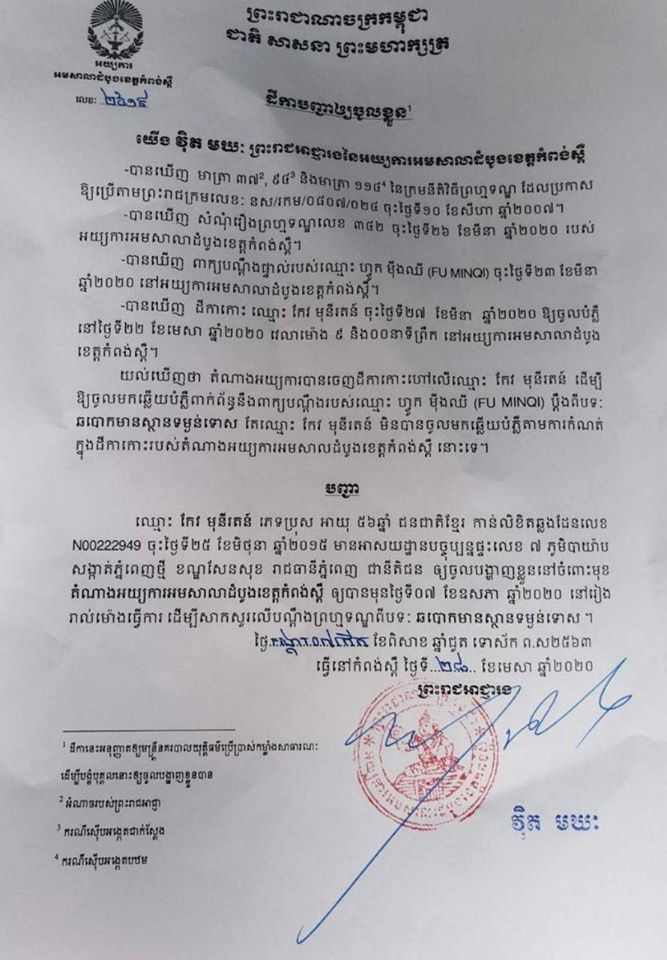 ព្រះរាជអាជ្ញារងខេត្តកំពង់ស្ពឺ លោក វ៉ិត មឃៈ នៅថ្ងៃទី២៨ ខែមេសា ឆ្នាំ២០២០នេះ បានចេញដីកាបង្គាប់ឲ្យចូលខ្លួន លោក កែវ មុនីរតន៍ ភេទប្រុស អាយុ៥៦ឆ្នាំ ជនជាតិខ្មែរ កាន់លិខិត ឆ្លងដែនលេខ N00222949 ចុះថ្ងៃទី២៥ ខែមិថុនា ឆ្នាំ២០១៥ មានអាសយដ្ឋានបច្ចុប្បន្នផ្ទះលេខ៧ ភូមិបាយ៉ាប សង្កាត់ភ្នំពេញថ្មី ខណ្ឌសែនសុខ រាជធានីភ្នំពេញ ជានីតិជន ឲ្យចូលបង្ហាញខ្លួននៅចំពោះមុខ តំណាងអយ្យការអមសាលាដំបូងខេត្តកំពង់ស្ពឺ ឲ្យបានមុនថ្ងៃទី០៧ ខែឧសភា ឆ្នាំ២០២០ នៅរៀងរាល់ម៉ោងធ្វើការ ដើម្បីសាកសួរលើបណ្តឹងព្រហ្មទណ្ឌពីបទ «ឆបោកមានស្ថានទម្ងន់ទោស»។ ដីកានេះអនុញ្ញាតឲ្យមន្ត្រីនគរបាលយុត្តិធម៌ ប្រើប្រាស់កម្លាំងសាធារណៈ ដើម្បីបង្ខំបុគ្គលនោះឲ្យចូលបង្ហាញខ្លួន។