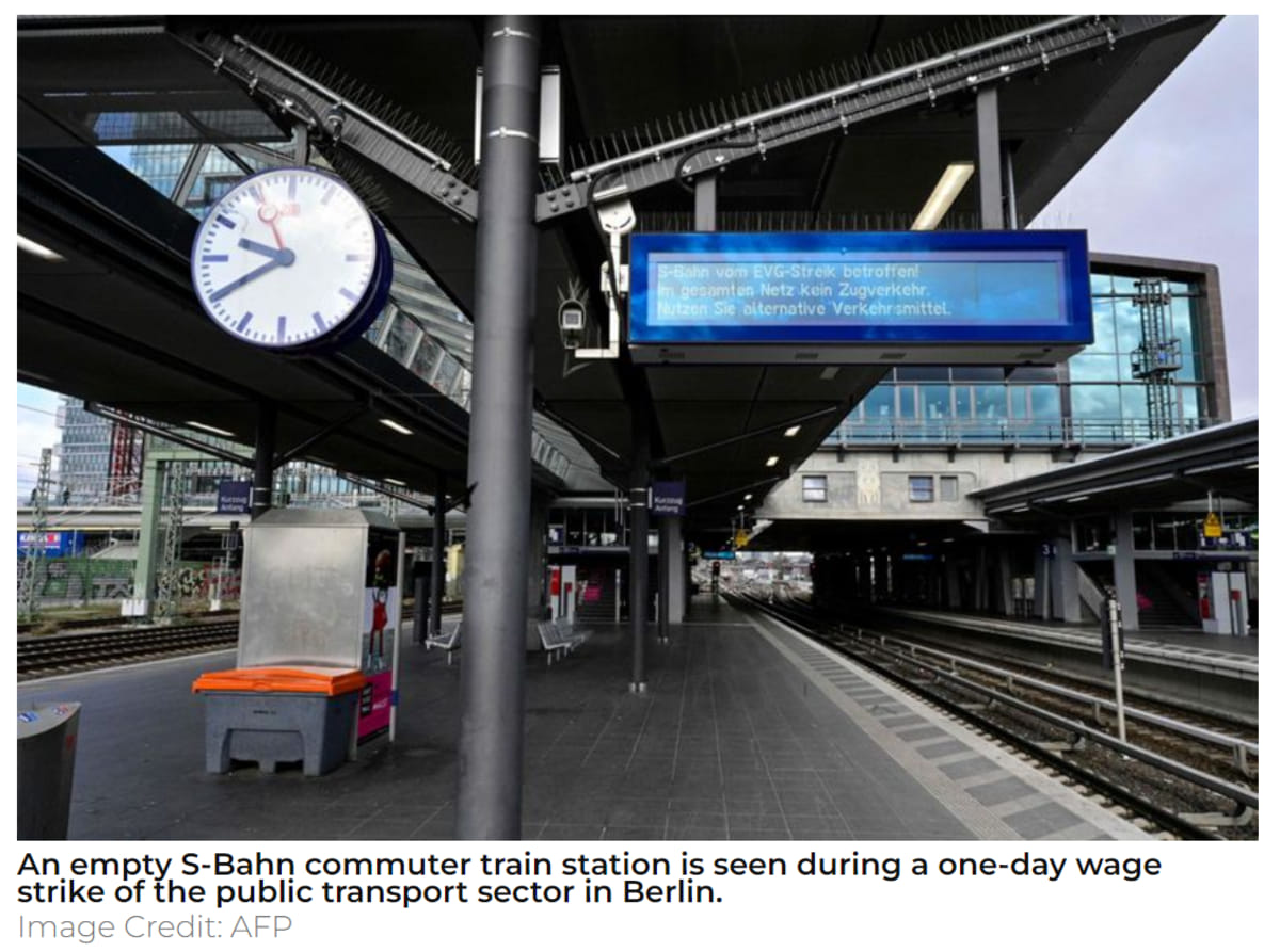 អ្នកធ្វើដំណើរ ក្នុងប្រទេសអាឡឺម៉ង់ ត្រូវដោះស្រាយភាពចលាចល ក្នុងការដឹកជញ្ជូនកាលពីថ្ងៃច័ន្ទ ជាមួយនឹងទីក្រុងនានា ដែលជាប់គាំង ដោយសារតែកូដកម្មដ៏ធំមួយ ដោយជំរុញឱ្យមានការដំឡើងប្រាក់ឈ្នួល នៅ ពេលប្រឈមមុខ នឹងការកើនឡើងអតិផរណា។