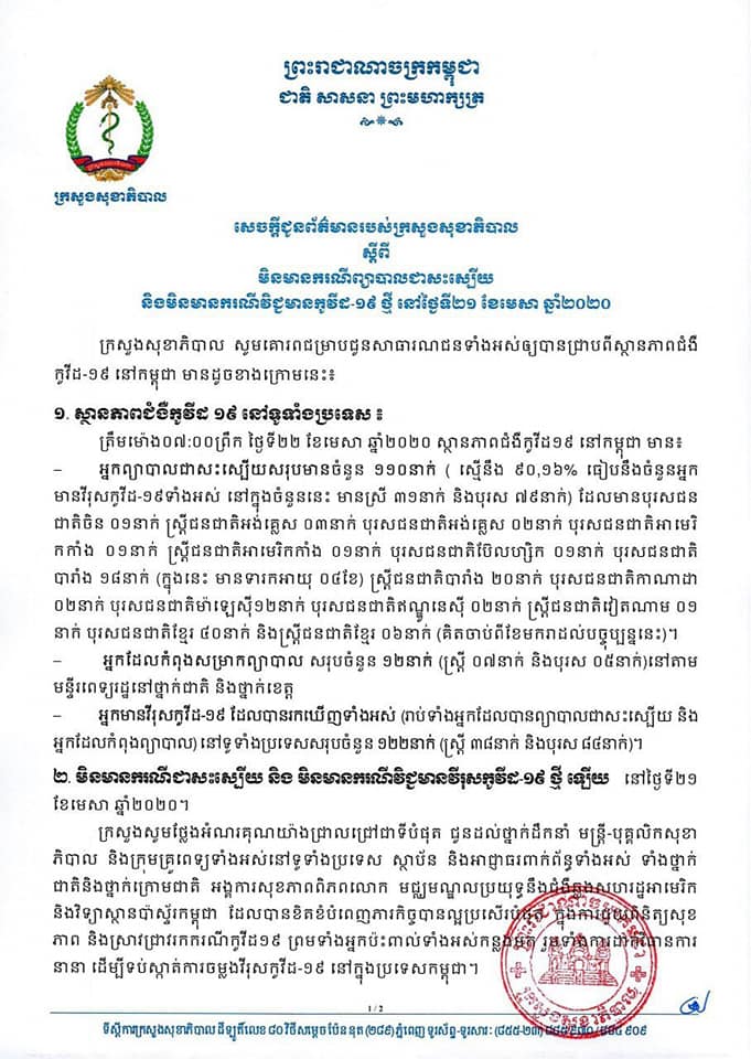 មកដល់ពេលនេះជាសះស្បើយមានចំនួន ១១០ នាក់ នៅសល់១២ នាក់ផ្សេងទៀតកំពុងសម្រាកព្យាបាល។