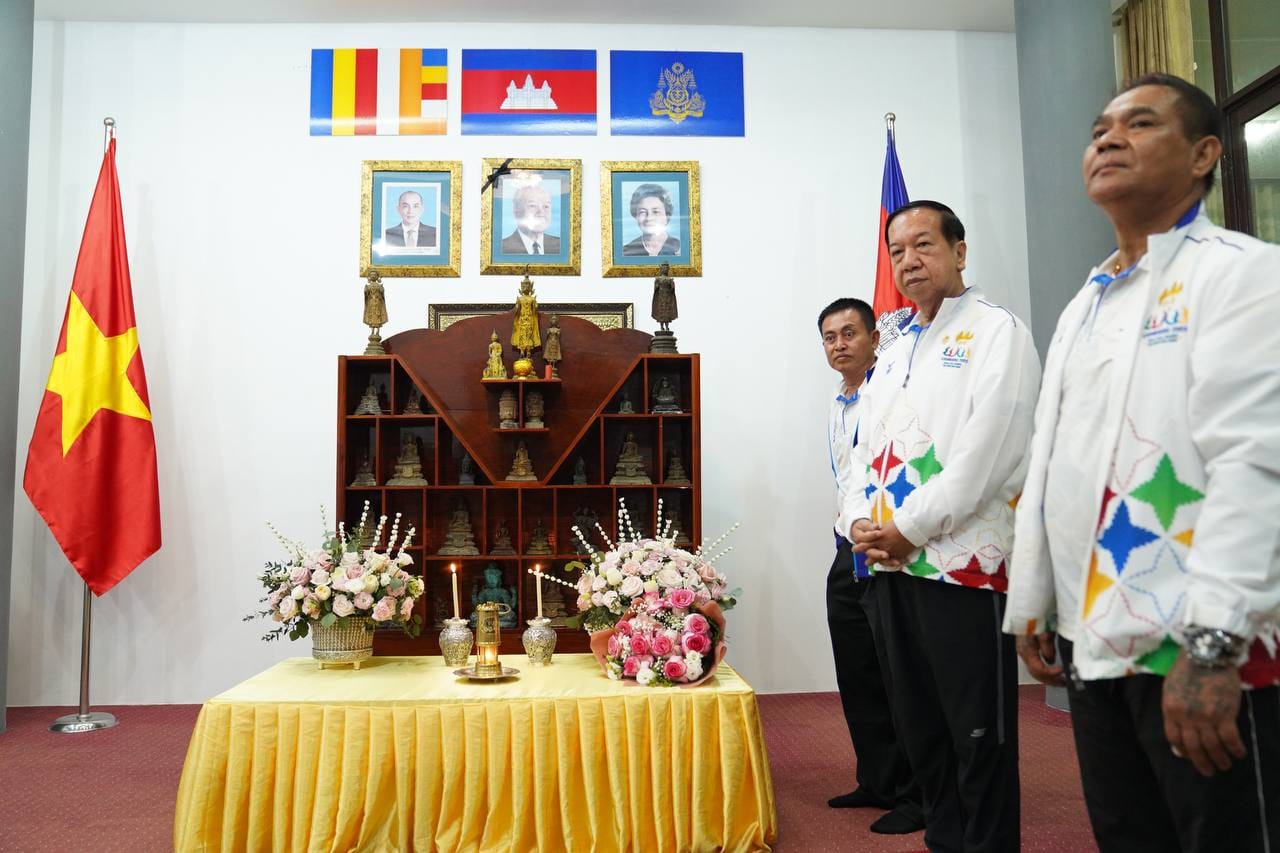 ឯកឧត្តម ហោ សារុន រដ្ឋលេខាធិការក្រសួង ទេសចរណ៍ និងជាបេសកជនពិសេសតំណាងគណៈកម្មាធិការជាតិរៀបចំការប្រកួតកីឡាស៊ីហ្គេម និងអាស៊ានប៉ារ៉ាហ្គេម អញ្ជើញដឹកនាំក្បួនដង្ហែព្រះអគ្គិជ័យកីឡា និងភ្លើងគប់កីឡាស៊ីហ្គេម-អាស៊ានប៉ារ៉ាហ្គេម បានធ្វើដំណើរទៅដល់អាកាស យានដ្ឋានអន្តរជាតិណូយបៃ (Noi Bai) រដ្ឋធានីហាណូយ ប្រទេសវៀតណាម ដោយសុវត្ថិភាព នាថ្ងៃទី២២ ខែមីនា ឆ្នាំ២០២៣ ដោយមានការអញ្ជើញទទួល ស្វាគមន៍ពីលោកជំទាវ ជា គឹមថា ឯកអគ្គរាជទូតកម្ពុជា ប្រចាំប្រទេសវៀតណាម និងលោកស្រី Le Hoang Yen អគ្គនាយករង នៃអគ្គនាយកដ្ឋានកីឡាវៀតណាម។