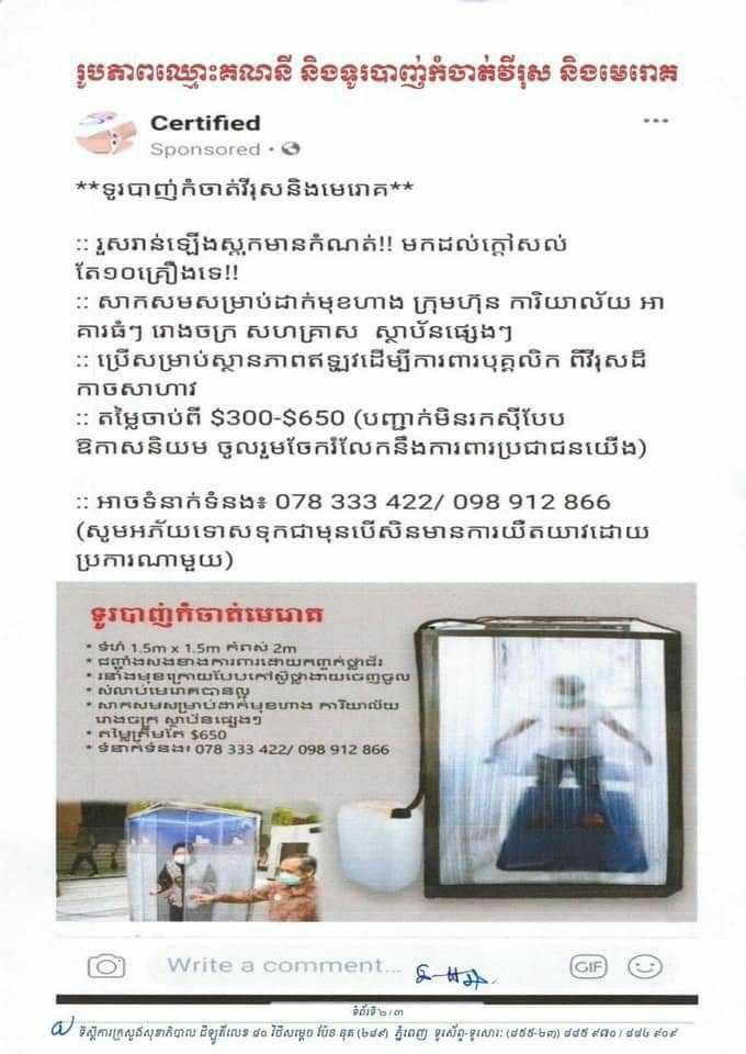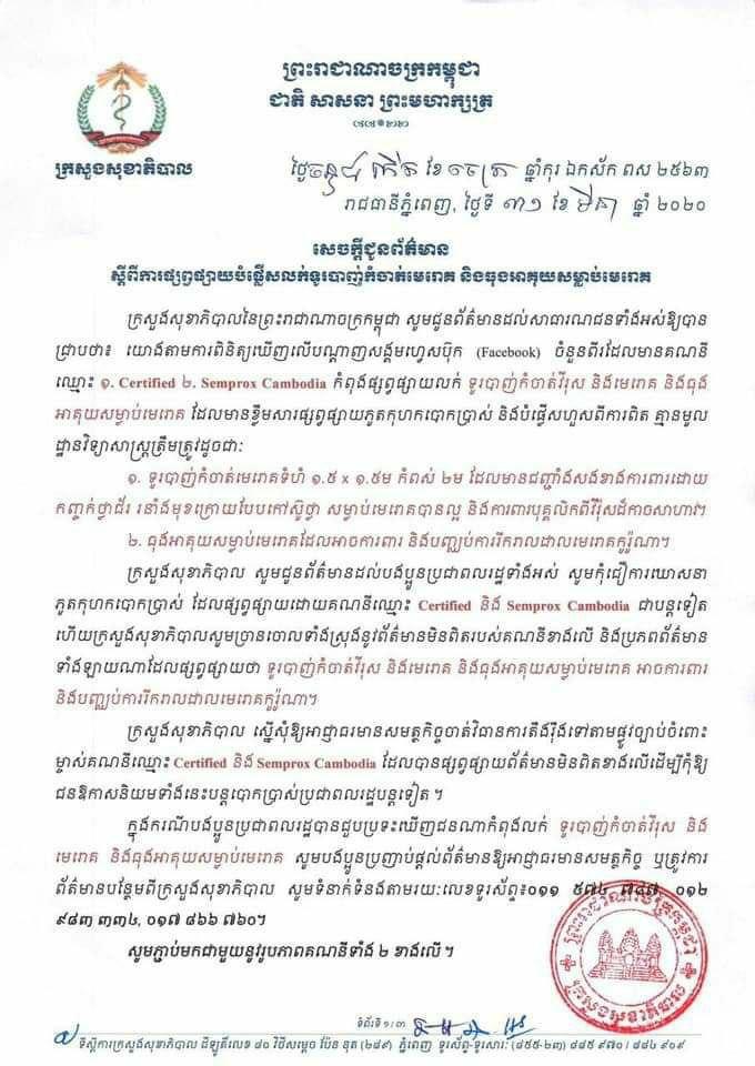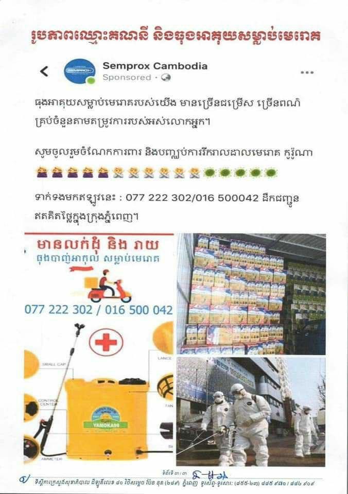 ការប្រកាសនេះបន្ទាប់ពីមានបណ្ដាញសង្គមហ្វេសប៊ុកមួយចំនួន បានធ្វើការផ្សព្វផ្សាយលក់ទូបាញ់ថ្នាំកម្ចាត់មេរោគ កូរ៉ូ ណា ដែលក្រសួងចាត់ទុកថា ជាការភូតកុហកបោកប្រាស់ ។