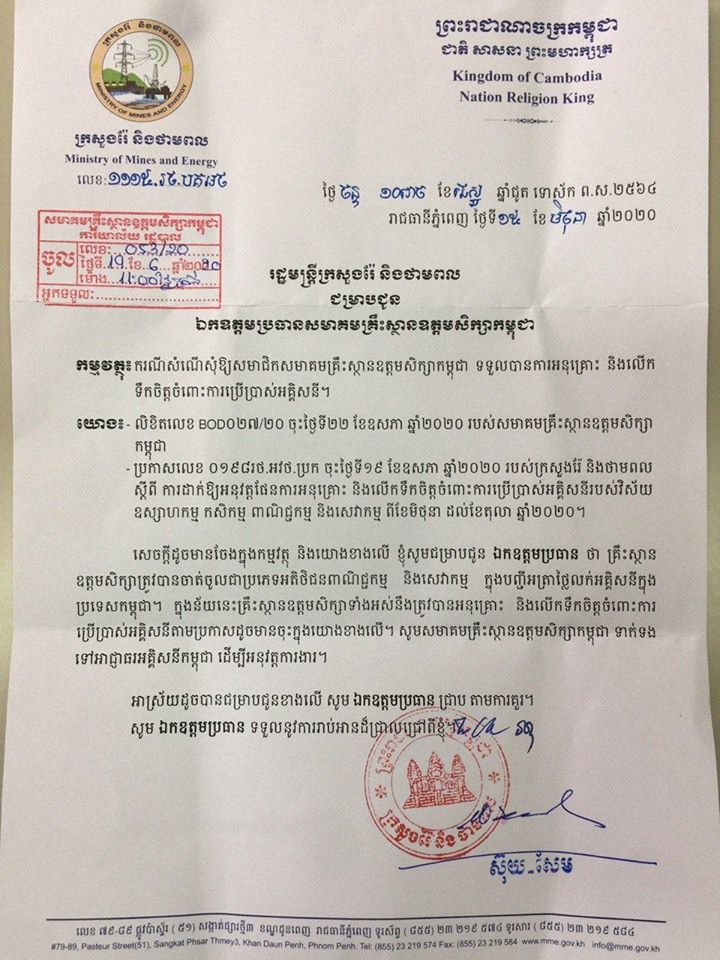 ក្រសួងរ៉ែ និងថាមពល យល់ព្រមទៅ​តាម​ការស្នើរបស់គ្រឹះស្ថានឧត្តមសិក្សាកម្ពុជា ក្នុងការបន្ធូរបន្ថយអគ្គិសនី