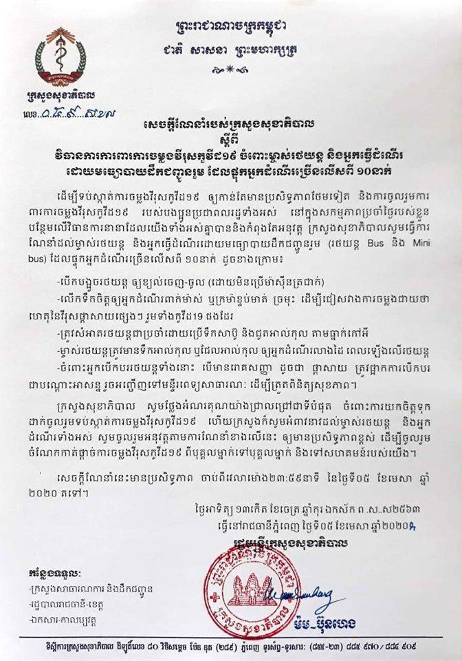 ក្រសួងសុខាភិបាលនៅថ្ងៃទី៥ មេសា នេះ បានចេញសេចក្ដីណែនាំមួយមួយស្ដីពីវិធានការការពារការចម្លងវីរុសកូវី១៩ចំពោះម្ចាស់រថយន្ត និងអ្នកធ្វើដំណើរដោយមធ្យោបាយដឹកជញ្ជូន រួមដែលដឹកអ្នកដំណើចាប់ពី១០នាក់ឡើងទៅ Apr ០៦ ០៩:០៤:៥៧ ព្រឹក ២០២០ ១៤៤៦ Views សេចក្ដីណែនាំមានខ្លឹមសារទាំងស្រុងដូចខាងក្រោម៖ ចែករំលែកបន្ត Share Tweet +1 Share Share មើលអត្ថបទផ្សេងទៀត Scroll Back To Top សាលាមតេ្តយ្យស្តង់ដារជប៉ុន នឹងបើកដំណើរការនៅភ្នំពេញ នាខែឧសភា ឆ្នាំ២០២៦ មន្ត្រីជាន់ខ្ពស់ក្រសួងពាណិជ្ជកម្ម ចុះត្រួតពិនិត្យទីតាំងមជ្ឈមណ្ឌលពាណិជ្ជកម្មឯកជនកម្ពុជា នៅទីក្រុងអាស៊ូហ្គី ខេត្តកាណាហ្កាវ៉ា ប្រទេសជប៉ុន រាជរដ្ឋាភិបាល សម្រេចឱ្យក្រសួងការពារជាតិ ជ្រើសរើសពល ទាហានថ្មី ចំនួន៣០០នាក់
