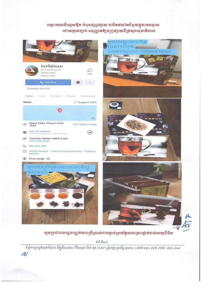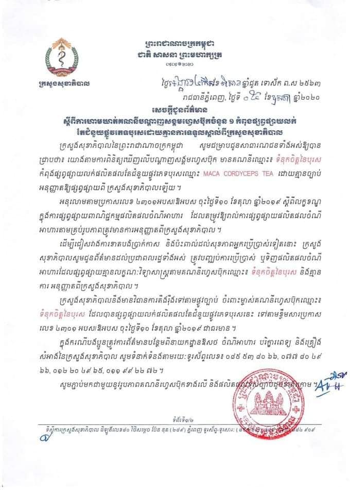 ក្រសួងសុខាភិបាល ព្រមានចាត់វិធានការចំពោះម្ចាស់បណ្ដាញសង្គមមួយ ដែលផ្សព្វផ្សាយលក់ផលិតផលតែជំនួយផ្លូវភេទឈ្មោះ MACA cordyceps Tea