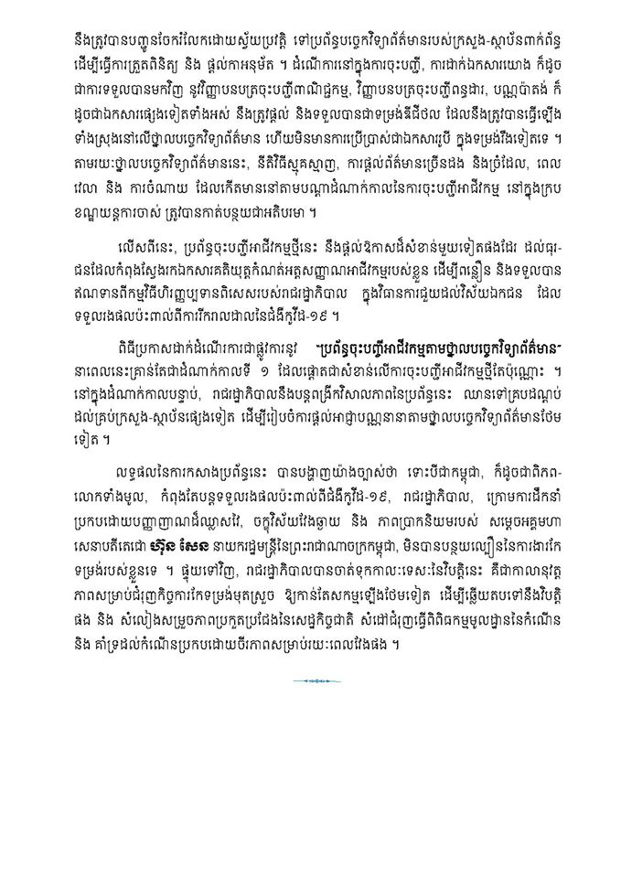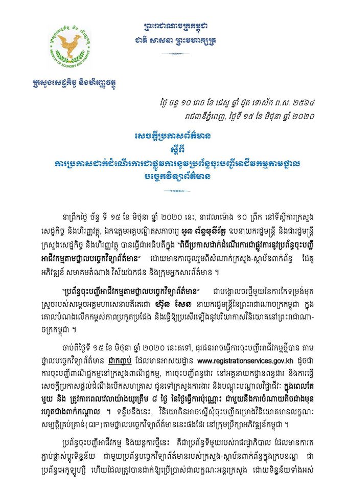 ក្រសួងសេដ្ឋកិច្ច និងហិរញ្ញវត្ថុ កាលពីព្រឹកថ្ងៃទី១៥ មិថុនានេះ បានប្រកាសដាក់ឱ្យដំណើរការជាផ្លូវការនូវប្រព័ន្ធចុះបញ្ជីអាជីវកម្មតាមថ្នាលបច្ចេកវិទ្យាព័ត៌មាន ដោយក្នុងពិធីនេះ ឯកឧត្តមអគ្គបណ្ឌិតសភាចារ្យ អូន ព័ន្ធមុនីរ័ត្ន ឧបនាយករដ្ឋមន្ត្រី រដ្ឋមន្ត្រីក្រសួងសេដ្ឋកិច្ច និងហិរញ្ញវត្ថុ មានប្រសាសន៍គូស បញ្ជាក់ថា៖ “ប្រព័ន្ធចុះបញ្ជីអាជីវកម្មតាមថ្នាលបច្ចេកវិទ្យាព័ត៌មាន” ជាបង្គោលចរថ្មីមួយនៃការកែទម្រង់មុតស្រួចរបស់សម្តេចអគ្គមហាសេនាបតីតេជោ ហ៊ុន សែន នាយករដ្ឋមន្ត្រីនៃព្រះរាជាណាចក្រកម្ពុជា ក្នុងគោលបំណងលើកកម្ពស់ភាពប្រកួតប្រជែង និងធ្វើឱ្យប្រសើរឡើងនូវបរិយាកាសវិនិយោគនៅព្រះរាជាណាចក្រកម្ពុជា ។