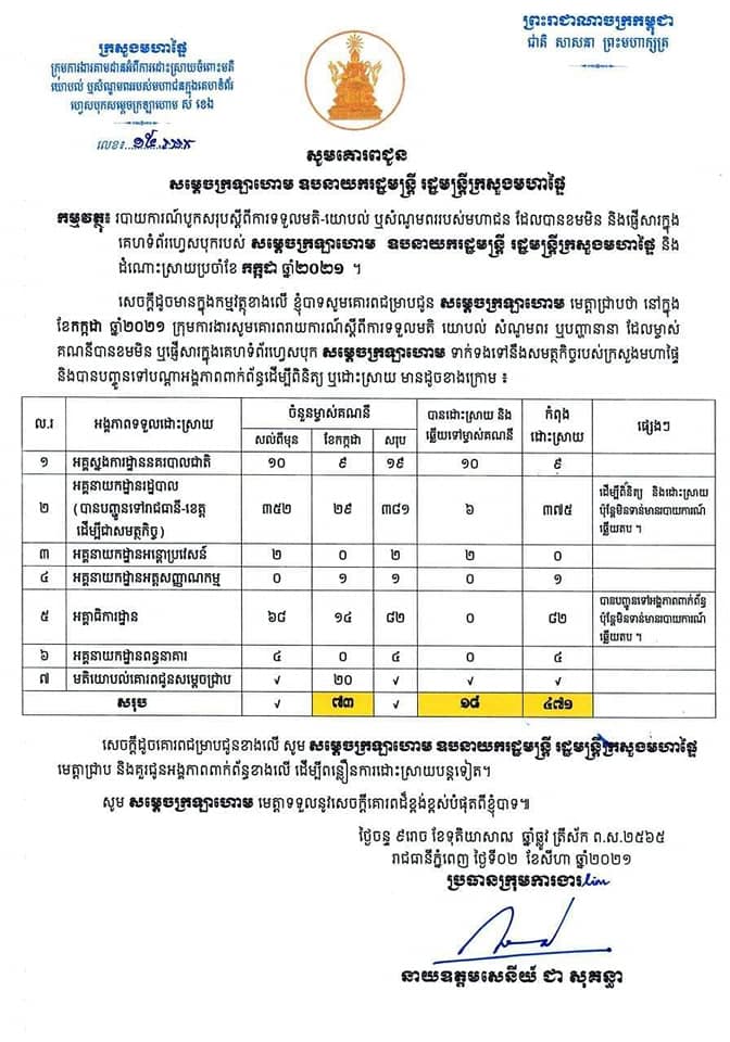 នៅក្នុងខែកក្កដា ឆ្នាំ២០២១នេះ ក្រុមការងារតាមដានអំពីការដោះស្រាយចំពោះមតិយោបល់ ឬសំណូមពររបស់បង ប្អូនប្រជាពលរដ្ឋ នៅក្នុងទំព័រហ្វេសប៊ុករបស់សម្តេចក្រឡា ហោម ស ខេង ឧបនាយករដ្ឋមន្ត្រីរដ្ឋមន្ត្រីក្រសួងមហាផ្ទៃ