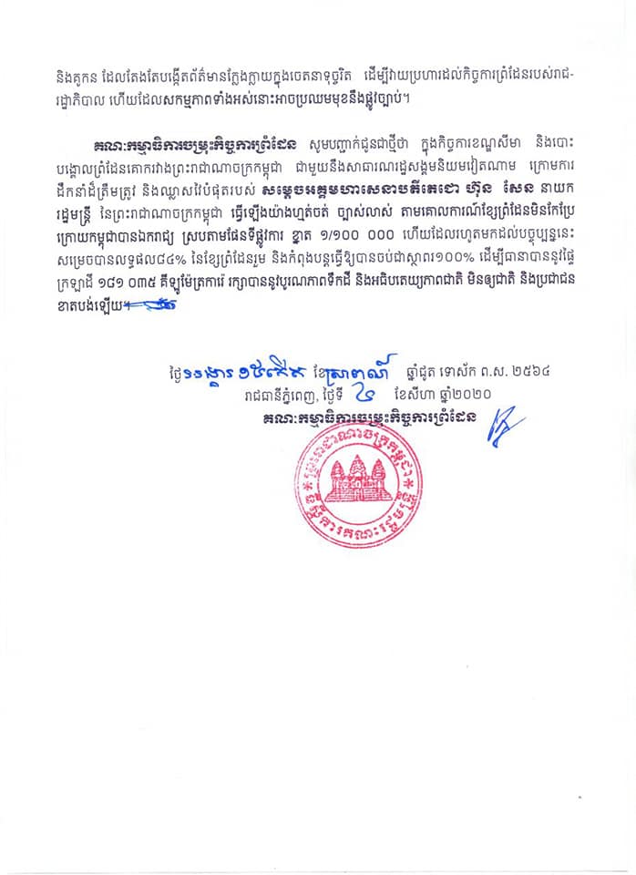 គណៈកម្មការព្រំដែនកម្ពុជា ចាត់ទុកនេះជាការចោទប្រកាន់ ដោយគ្មានមូលដ្ឋាន ព៌តមានមិនពិត ក្នុងចេតនាទុច្ចរិត បំភ័ន្តសាធារណៈមតិជាតិ និងអន្តរជាតិ ឲ្យមានយល់ច្រឡំ មកលើរាជរដ្ឋាភិបាលពីការធ្វើឲ្យបាត់បង់ទឹកដី បណ្ដោយឲ្យមានការរំលោភបំពានប្រទេសវៀតណាម។
