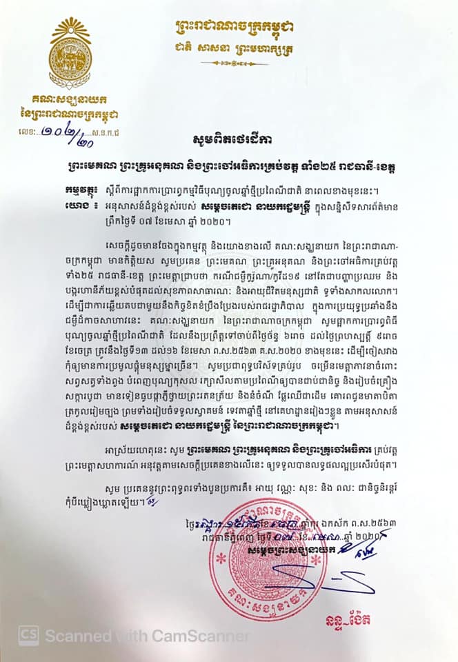 គណៈសង្ឃនាយក នៃព្រះរាជាណាចក្រកម្ពុជា នៅថ្ងៃទី៨ ខែមេសា នេះ បានចេញសេចក្តីជូនដំណឹងទៅកាន់គ្រប់វត្តអារាមទាំង២៥ រាជធានី-ខេត្ត ស្តីពីការផ្អាកការប្រារព្ធកម្មវិធីបុណ្យចូលឆ្នាំថ្មីប្រពៃណីជាតិ ដោយបញ្ជាក់ថា ដើម្បីចូលរួមទប់ស្កាត់ការរីករាលដាលនៃវីរុសកូវីដ១៩។
