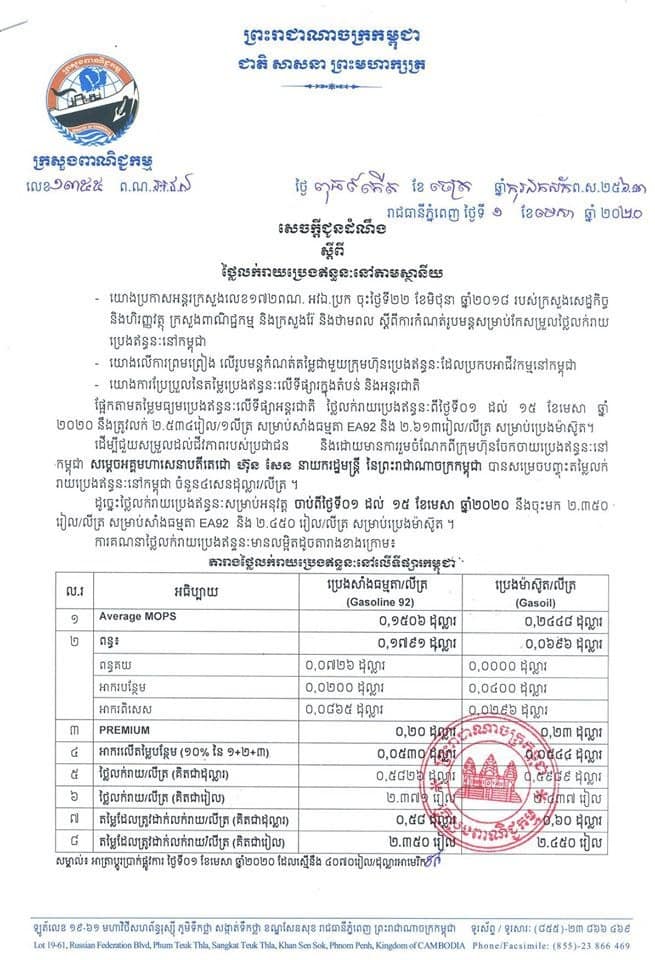 នេះបើយោងតាមសេចក្តីជូនដំណឹងរបស់ក្រសួងពាណិជ្ជកម្ម ស្ដីពីតម្លៃលក់ប្រេងនៅតាមស្ថានីយ៍ប្រេងនៅកម្ពុជា