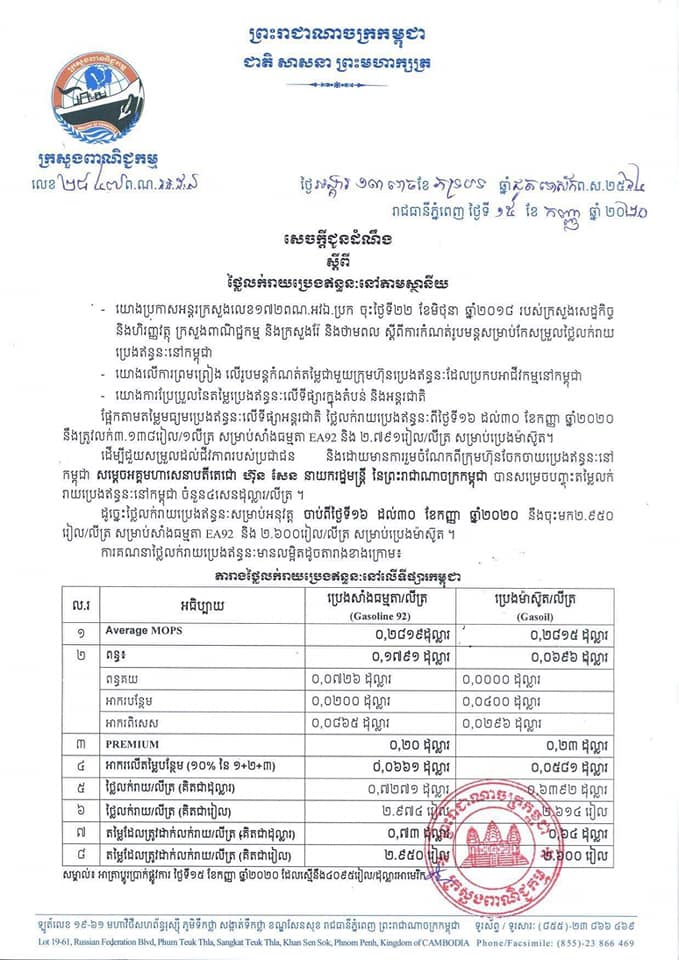 តាមសេចក្តីជូនដំណឹង របស់ក្រសួងពាណិជ្ជកម្ម ឲ្យដឹងថាចាប់ពីថ្ងៃទី១៦ ដល់ថ្ងៃ៣០ ខែកញ្ញា តម្លៃប្រេងឥន្ធនៈលក់ រាយនៅតាមស្ថានីយ៍ប្រេងឥន្ទនៈនៅទូទាំងប្រទេស ចុះថ្លៃ ១០០រៀល។ តម្លៃប្រេងសាំងធម្មតាលក់ ២៩៥០រៀល ក្នុងមួយលីត្រ និងតម្លៃប្រេងម៉ាស៊ូត២៦០០រៀល ក្នុងមួយលីត្រ ។