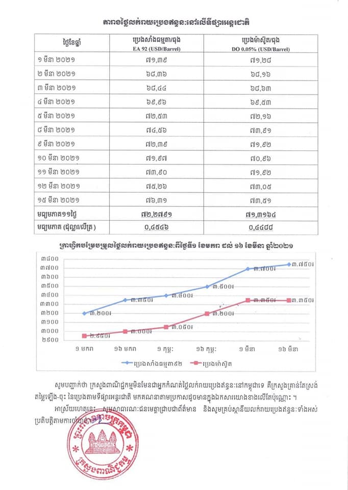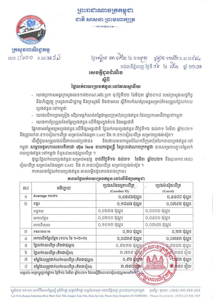បើតាមការបញ្ជាក់ក្នុងសេចក្តីជូនដំណឹងរបស់ក្រសួងពាណិជ្ជកម្ម ផ្អែកតាមតម្លៃមធ្យមប្រេងឥន្ធនៈលើទីផ្សារអន្តរជាតិ ថ្លៃលក់រាយពីថ្ងៃទី១៦ ខែមីនា ដល់៣១ ខែមីនា ឆ្នាំ២០២១ នឹងត្រូវលក់ ៣.៩១០រៀល/លីត្រ សម្រាប់សាំងធម្មតា និង ៣.៥១០រៀល/លីត្រ សម្រាប់ប្រេងម៉ាស៊ូត។