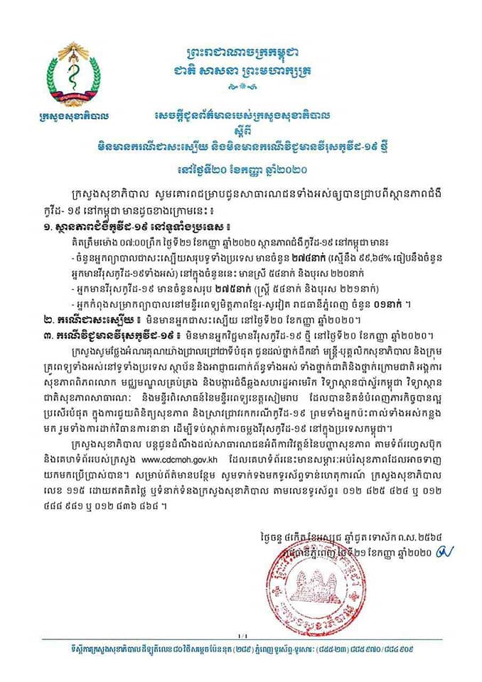 នៅព្រឹកថ្ងៃទី២១ ខែកញ្ញា ឆ្នាំ២០២០ នេះក្រសួងសុខាភិបាល បានបញ្ជាក់ថា ក្រសួងមិនមានរកឃើញករណីឆ្លងជំងឺកូវីដ១៩ថ្មីនោះទេ ហើយក៏គ្មានករណីព្យាបាលជាសះស្បើយថ្មីនោះដែរ អ្នកជំងឺកំពុងសម្រាកនៅមន្ទីរពេទ្យមានម្នាក់ដដែល។