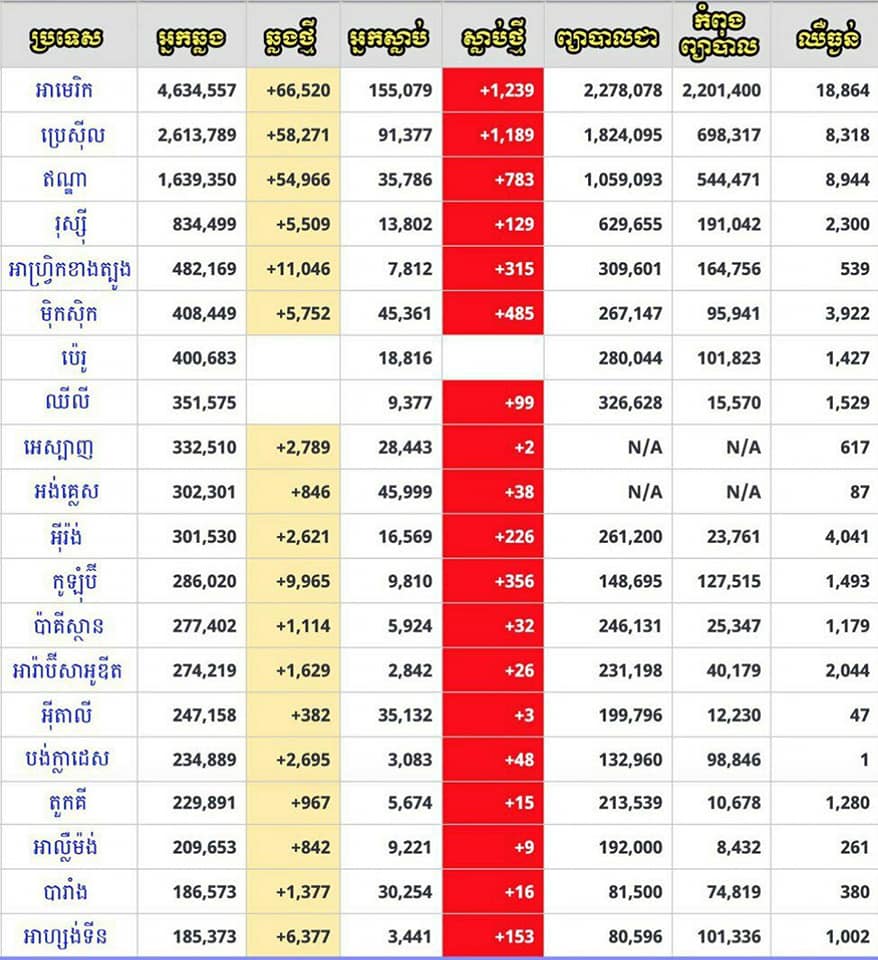 គេហទំព័រអន្តរជាតិ Worldometer រាយការណ៍ថា ជំងឺកូវីដ១៩ នៅតែមានសភាពស្រួចស្រាវ ហើយសហរដ្ឋអាមេរិក នៅតែជាប្រទេសមានចំនួនអ្នកឆ្លង និងស្លាប់ដោយសារជំងឺនេះច្រើនជាងគេ គឺចំនួន ៤.៦៣៤.៥៥៧នាក់ ស្លាប់ចំនួន ១៥៥.០៧៩នាក់ និងជាសះស្បើយចំនួន ២.២៧៨.០៧៨នាក់។