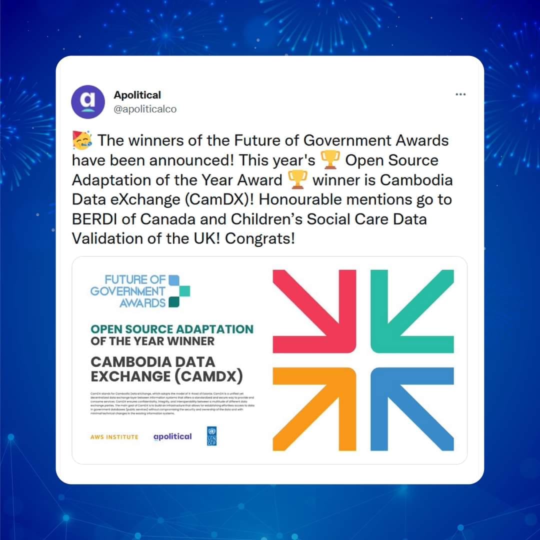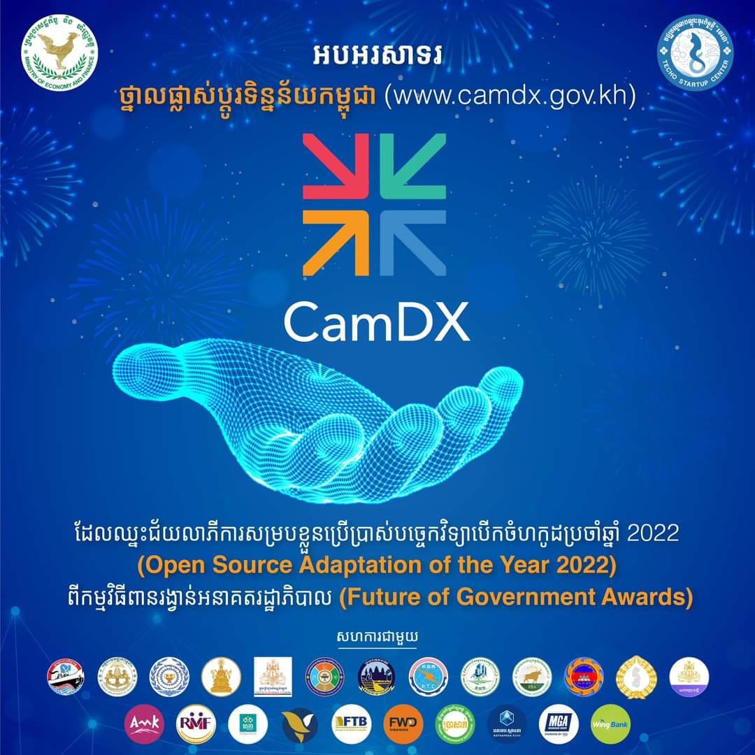 សេចក្តីប្រកាសព័ត៌មានរបស់ក្រសួងសេដ្ឋកិច្ច និងហិរញ្ញ វត្ថុ បានឲ្យដឹងថា “ថ្នាលផ្លាស់ប្តូរទិន្នន័យកម្ពុជា Cambodia Data eXchange ហៅកាត់ថា CamDX) ត្រូវបានប្រកាសទទួលជ័យលាភី Open Source Adaptation of the Year ពីកម្មវិធីពានរង្វាន់អនាគតរដ្ឋាភិបាល (Future of Government Awards) ដែលបានសហការគាំទ្រដោយអង្គការកម្មវិធីអភិវឌ្ឍន៍សហប្រជាជាតិ (UNDP), Amazon Web Service Institute នៃក្រុមហ៊ុនអន្តរជាតិអាម៉ាហ្សូន, និងបណ្តាញសាកលសម្រាប់រដ្ឋាភិបាល Apolitical ដែលមានគម្រោងចូលរួមប្រកួត ប្រជែងចំនួន ១៥០ និងមកពី ៥២ ប្រទេស សម្រាប់កម្មវិធីទាំងមូល។ កម្ពុជាជាប្រទេសមួយក្នុងគម្រោងចំនួន ១០ ដែលមកពីប្រទេសចំនួន ៨ ទៀត ដែលស្ថិតក្នុងបញ្ជីសម្រាំង (Shortlisted) ក្នុងផ្នែកជ័យលាភី Open Source Adaptation ដែលរួមមាន កាណាដា, ចក្រភពអង់គ្លេស, អាហ្វ្រិកខាងត្បូង, ប៉ាគីស្ថាន, ហ្គីណេប៊ីសូ (Guinea-Bissau) អាហ្សង់ទីន, ហ្វីលីពីន និងបេណាំង ហើយដែលចុងក្រោយត្រូវបានសម្រេចពីគណៈ-កម្មការវាយតម្លៃអន្តរជាតិ ចំនួន ១៧ រូប ឱ្យឈ្នះជ័យលាភីលេខ១ ប្រចាំឆ្នាំ ២០២២ នេះ ។