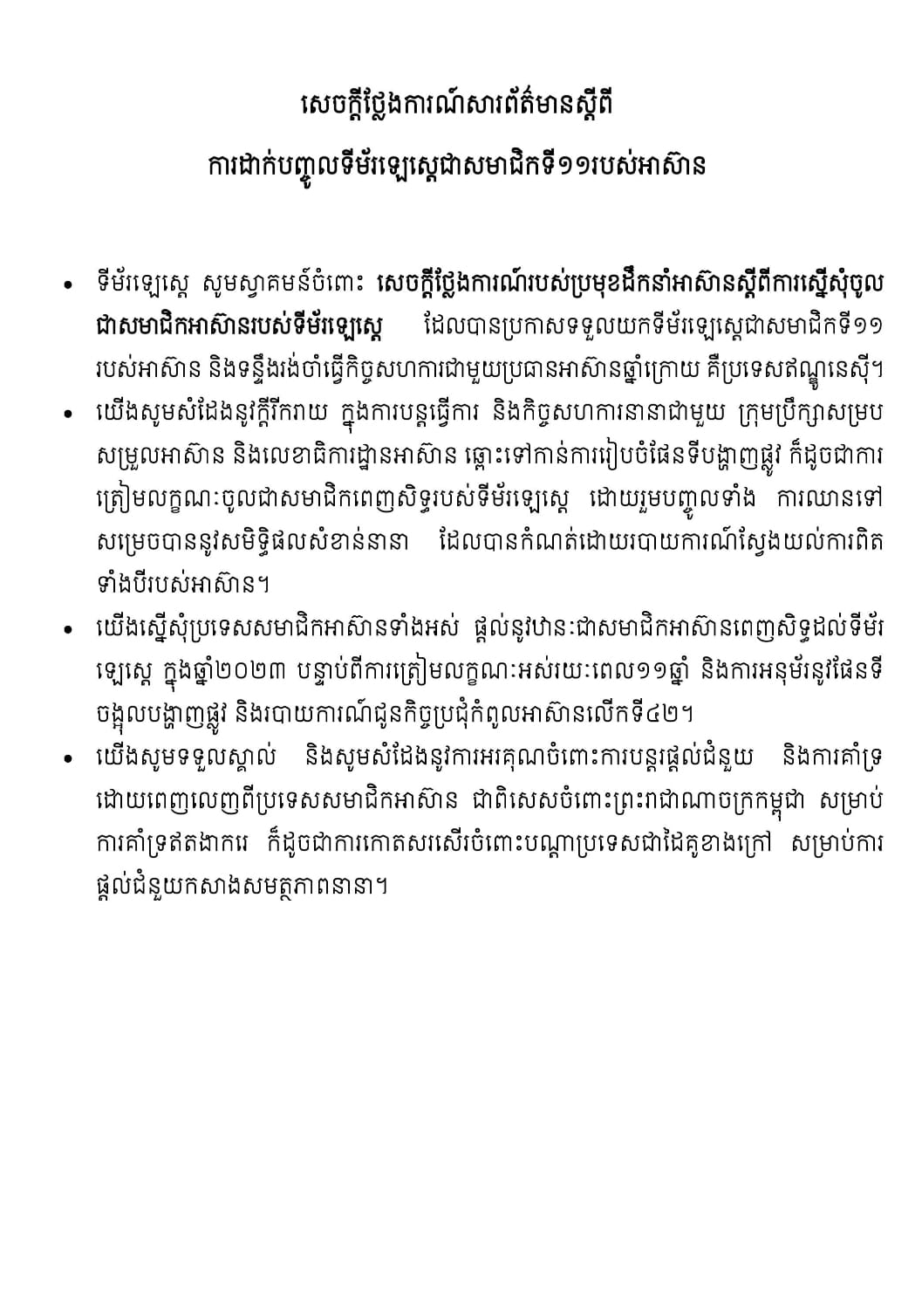 រដ្ឋាភិបាលទីម័រឡេស្តេ សូមទទួលស្គាល់ និងសូមសំដែងនូវការអរគុណចំពោះការបន្តផ្ដល់ជំនួយ និងការគាំទ្រ ដោយពេញលេញពីប្រទេសសមាជិកអាស៊ាន ជាពិសេសចំពោះព្រះរាជាណាចក្រកម្ពុជា សម្រាប់ ការគាំទ្រឥតងាក ក៏ដូចជាការកោតសរសើរចំពោះបណ្តាប្រទេសជាដៃគូខាងក្រៅ សម្រាប់ការ ផ្តល់ជំនួយកសាងសមត្ថភាពនានា៕