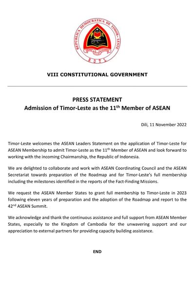 រដ្ឋាភិបាលទីម័រឡេស្ត នៅថ្ងៃទី១១ ខែវិច្ឆិកា បានចេញសេចក្តីថ្លែងការណ៍ សម្តែងភាពរីករាយចំពោះការសម្រេ ចជា គោលការណ៍របស់មេដឹកនាំអាស៊ាន ក្នុងការ អនុញ្ញាតឱ្យទីម័រចូលជាសមាជិកអាស៊ាន ទី១១ ហើយប្តេជ្ញាអនុវត្ត ដើម្បីក្លាយជាសមាជិកពេញសិទ្ធិ ឆាប់ៗនេះ។ រដ្ឋាភិបាលទីម័រឡេស្តេ បានប្រកាសស្វាគមន៍ចំពោះ សេចក្តីថ្លែងការណ៍របស់ប្រមុខដឹកនាំអាស៊ានស្តីពីការស្នើសុំចូលជាសមាជិកអាស៊ានរបស់ទីម័រឡេស្ដេរ ដែលបានប្រកាសទទួលយកទីម័រឡេស្តេជាសមាជិកទី១១ របស់អាស៊ាន និងទន្ទឹងរង់ចាំធ្វើកិច្ចសហការជាមួយប្រធានអាស៊ានឆ្នាំក្រោយ គឺប្រទេសឥណ្ឌូនេស៊ី។