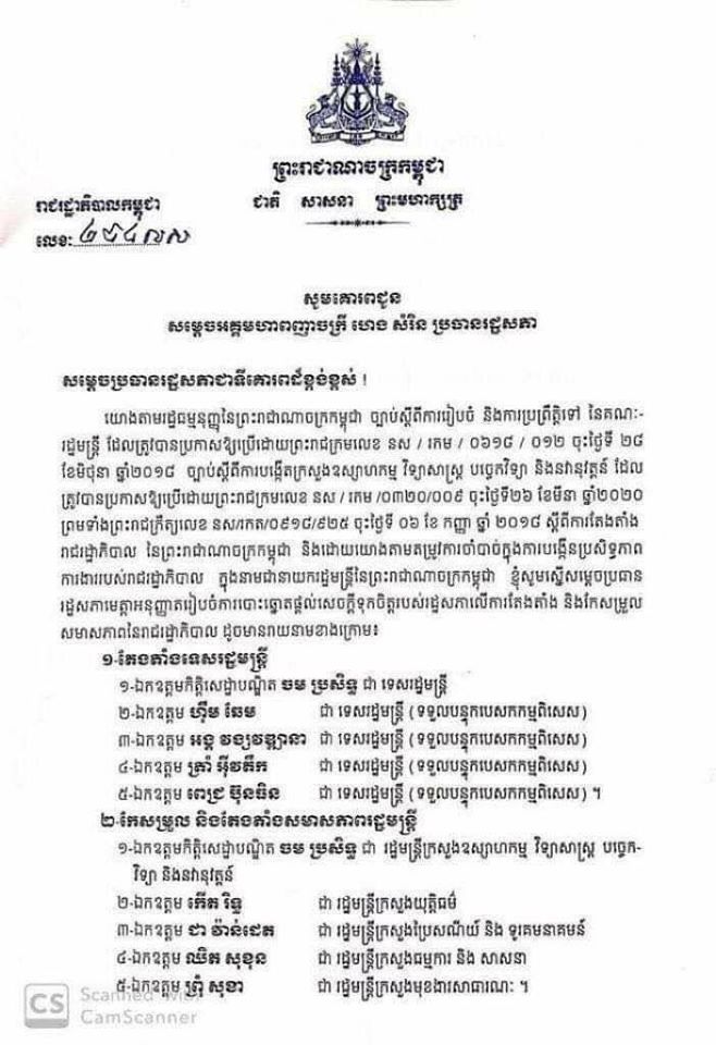 សុំសម្ដេចប្រធានរដ្ឋសភារៀបចំការបោះឆ្នោតផ្ដល់សេចក្ដីទុកចិត្តរបស់រដ្ឋសភា លើការតែងតាំងនិងកែសម្រួលសមាសភាពនៃរាជរដ្ឋាភិបាលដូចមានរាយនាមខាងក្រោម៖