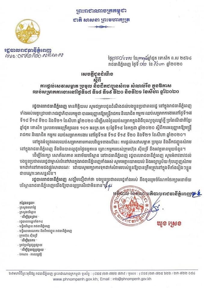 រដ្ឋបាលរាជធានីភ្នំពេញ បានជូនដំណឹងទៅដល់បងប្អូនប្រជាពលរដ្ឋ រស់នៅរាជធានីភ្នំពេញ ពីការរអាក់រអួលនិងការប្រមូលសំរាមមិនបានពេញលេញ នៅក្នុងឱកាសថ្ងៃឈប់សងបុណ្យចូលឆ្នាំរយៈពេល ៥ ថ្ងៃខាងមុខនេះ ដោយសារកម្មករនៃក្រុមហ៊ុនសិនទ្រី ត្រូវបានអនុញ្ញាតឲ្យឈប់សម្រាកផងដែរ។ រដ្ឋបាលរាជធានីភ្នំពេញសុំការយោគយល់ពីបង ប្អូនប្រជាពលរដ្ឋ និងអធ្យាស្រ័យកុំបញ្ចេញសំរាម មុខដាក់នៅលើផ្លូវសាធារណៈ ដោយរក្សាទុកសំរាមឲ្យបានត្រឹមត្រូវរាងរៀងខ្លួនបណ្ដោះអាសន្ន។