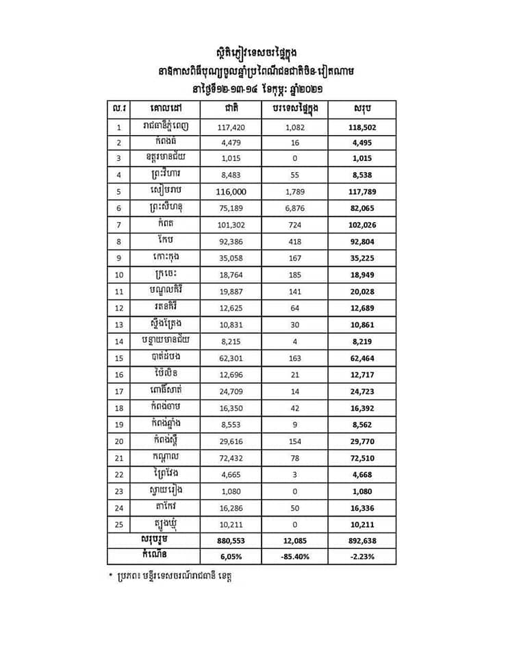 តាមរបាយការណ៍ទទួលបានពីមន្ទីរទេសចរណ៍រាជធានី ខេត្ត បានឲ្យដឹងថា៖ នាឱកាសពិធីបុណ្យចូលឆ្នាំចិន-វៀតណាម រយៈពេល៣ថ្ងៃ (១២-១៤ ខែកុម្ភៈ ២០២១) កម្ពុជាទទួលបានភ្ញៀវទេសចរសរុបប្រមាណ ៨៩២.៦៣៨ នាក់ ថយចុះ២,២៣%ធៀបនឹងឆ្នាំ២០២០។