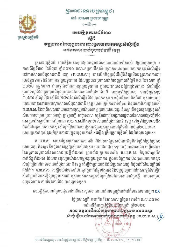 លោក ជិន ម៉ាលីន រដ្ឋលេខាធិការ និងជាអ្នកនាំពាក្យក្រសួងយុត្តិធម៌ បានបង្ហោះសារលើផេកហ្វេសប៊ុកផ្លូវការយ៉ាងដូច្នេះ នៅព្រឹកថ្ងៃទី២៦ ខែកក្កដា ឆ្នាំ២០២០ នេះ និងបានស្នើអង្គការចំនួនពីរ គឺអង្គការលើកលែងទោសអន្តរជាតិ និងសម្ព័ន្ធខ្មែរជំរឿន និងការពារសិទ្ធិមនុស្ស លីកាដូ ឲ្យត្រួតពិនិត្យឡើងវិញនូវសុក្រឹត្យភាព និងវិជ្ជាជីវៈរបស់ខ្លួន ក្នុងការចេញសេចក្តីថ្លែងការណ៍ដែលគ្មានមូលដ្ឋានច្បាស់លាស់ និងខុសពីការពិតនេះ។