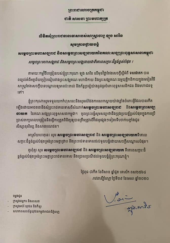 គួរបញ្ជាក់ដែរថាកាលពីម្សិលមិញ សម្ដេចព្រះសង្ឃនាយកនៃគណៈមហា និកាយ បានធ្វើលិខិតទៅក្រសួងអប់រំ យុវជន និងកីឡា វាសនាឲ្យមានវិធានការចំពោះលោកគ្រូ ឡុង សារិន ថាបានបន្តុះបង្អាប់ព្រះសង្ឃនៃគណៈមហានិកាយ និងលើកតម្កើនគណៈធម្មយុត្តិកនិកាយ។