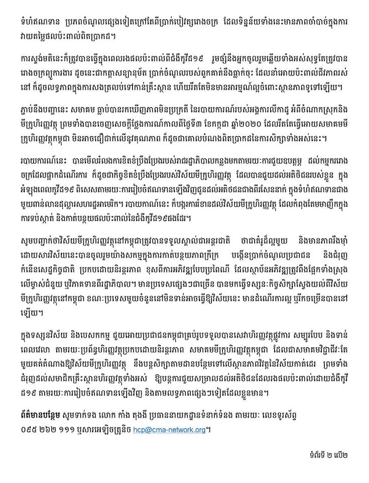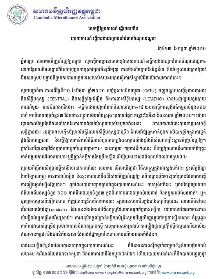 តាមរយៈសេចក្តីថ្លែងការណ៏របស់ខ្លួន សមាគមមីក្រូហិរញ្ញវត្ថុ បានចាត់ទុករបាយការណ៏របស់លីកាដូ សម្ព័ន្ធសហជីព និងមជ្ឈមណ្ឌលសម្ព័ន្ធភាពការងារ និងសិទ្ធិមនុស្ស ហៅកាត់ថា សង់ត្រាល់ ថាមិនមានភាពស៊ីសង្វាក់ នឹងទិន្នន័យ ហើយមូលដ្ឋាននៃវិធីសាស្ត្រស្រាវ​ជ្រាវមិនបានត្រឹមត្រូវ។