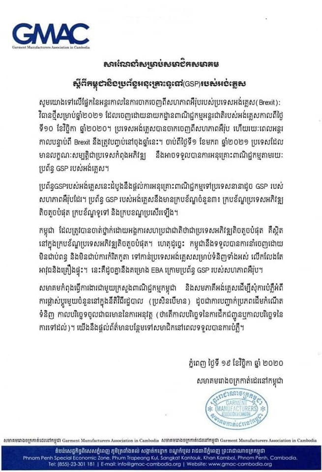 សមាគមរោងចក្រកាត់ដេរនៅកម្ពុជា ចេញសារណែនាំសម្រាប់សហជិកសមាគម ស្តីពីកម្ពុជា និងប្រព័ន្ធអនុគ្រោះទូទៅ (GSP) របស់ប្រទេសអង់គ្លេស