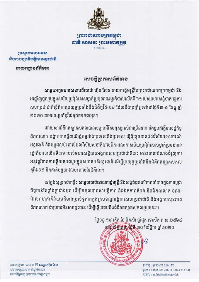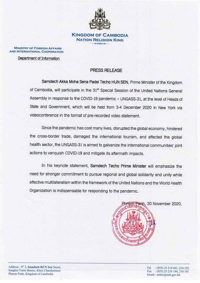 សម្តេចតេជោ ហ៊ុន សែន នាយករដ្ឋមន្រ្តីនៃព្រះរាជាណាចក្រកម្ពុជា នឹងអញ្ជើញចូលរួមក្នុងសម័យប្រជុំពិសេសថ្នាក់ប្រមុខរាជ/រដ្ឋាភិបាលលើកទី៣១ របស់មហាសន្និបាតអង្គការ សហប្រជាជាតិ ស្តីពីការប្រយុទ្ធប្រឆាំងនឹងជំងឺកូវីដ-១៩ ដែលនឹងប្រព្រឹត្តទៅនៅថ្ងៃទី៣-៤ ខែធ្នូ ឆ្នាំ២០២០ តាមរយៈប្រព័ន្ធវីដេអូថតទុកជាមុន។