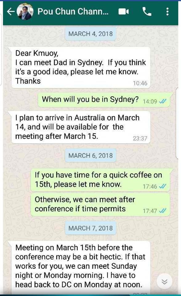 ច័ន្ទបុត្រ៖ ក្មួយជាទីស្រឡាញ់! ខ្ញុំអាចសុំជួប ពុក (សម្តេចតេជោ ហ៊ុន សែន) នៅទីក្រុងស៊ីដនីបាន។ ប្រសិនបើក្មួយយល់ថា នេះជាគំនិតល្អ សុំក្មួយឲ្យខ្ញុំដឹងផង។ សូមអរគុណច្រើន។