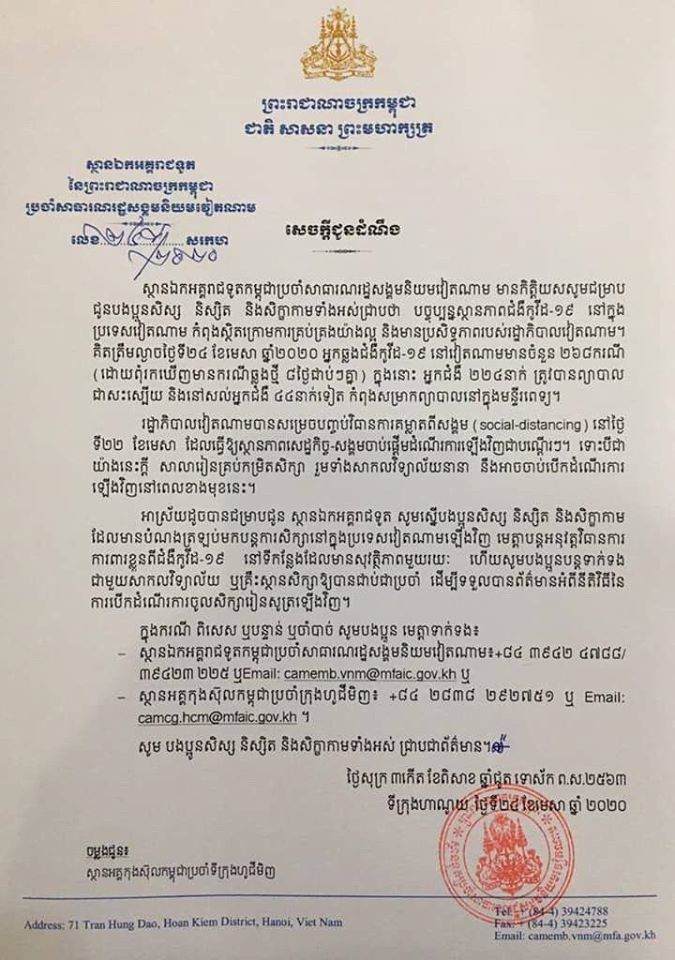 ស្ថានឯកអគ្គរាជទូតកម្ពុជាប្រចាំនៅសាធារណរដ្ឋសង្គមនិយមវៀតណាម បានជូនដំណឹងនៅថ្ងៃទី ២៤ ខែមេសា ឆ្នាំ២ឲ២០ នេះថា សិស្ស និស្សិត និងសិក្ខាកាមកម្ពុជាដែលមានបំណងចង់ទៅសិក្សានៅប្រទេសវៀតណាម ឲ្យត្រៀមខ្លួនដើម្បីទៅបន្តការសិក្សានៅទីនោះជាប្រក្រតីឡើងវិញ។