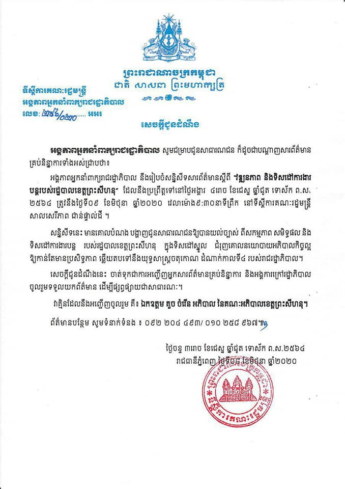 ឯកឧត្តមគួចចំរើនអភិបាលខេត្តព្រះសីហនុនឹងអញ្ជើញចូលរួមនៅក្នុងសន្និ សីទសារព័ត៌មានផ្ទាល់ ដើម្បីធ្វើការបកស្រាយនិងពន្យល់អំពីវឌ្ឍនភាពរបស់ខេត្តព្រះសីហនុ។