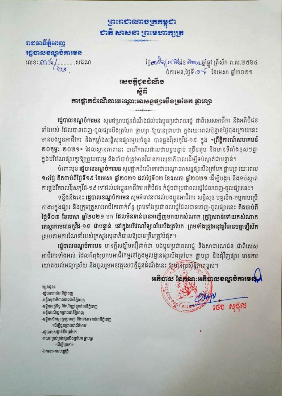 អាជ្ញាធរខណ្ឌចំការមន សម្រេចផ្អាកដំណើរការជាបណ្ដោះអាសន្នផ្សារបឹងត្របែកផ្លាហ្សា រយៈពេល ១៤ថ្ងៃ គិតចាប់ពីថ្ងៃទី១៩ ខែ មេសា ដល់ថ្ងៃទី០២ ខែឧសភា ឆ្នាំ២០២១ ដើម្បីបង្ការ និងទប់ស្កាត់ការឆ្លងរាលដាលវីរុសកូវីដ១៩ ទៅដល់បងប្អូនអាជីវករ អតិថិជន ក៏ដូចជាប្រជាពលរដ្ឋដែលចេញ-ចូលផ្សារនេះ។