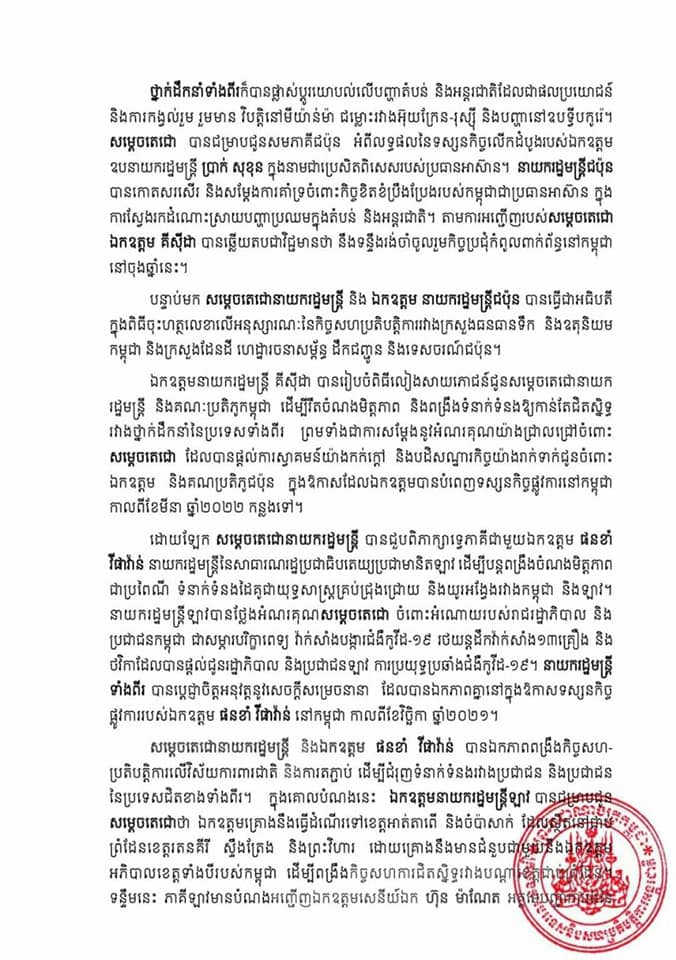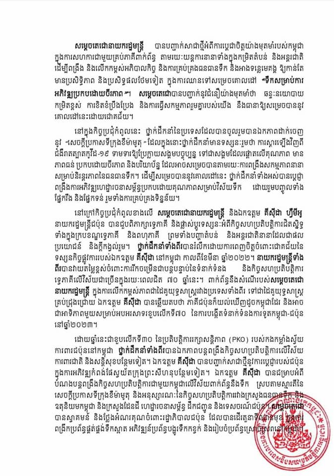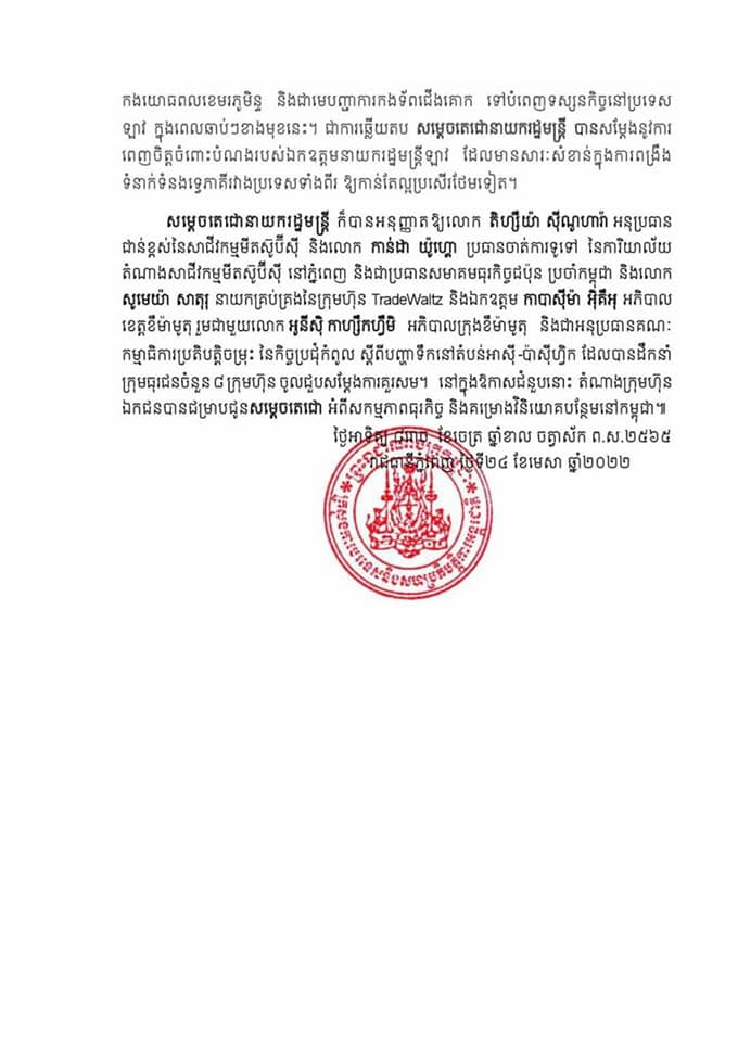 របស់សម្តេចអគ្គមហាសេនាបតីតេជោ ហ៊ុន សែន នាយករដ្ឋមន្រ្តីនៃព្រះរាជាណាចក្រកម្ពុជា នៅទីក្រុងខឹម៉ាមូតុ ប្រទេសជប៉ុន ពីថ្ងៃទី២៣ ដល់ទី ២៤ ខែមេសា ឆ្នាំ២០២២។