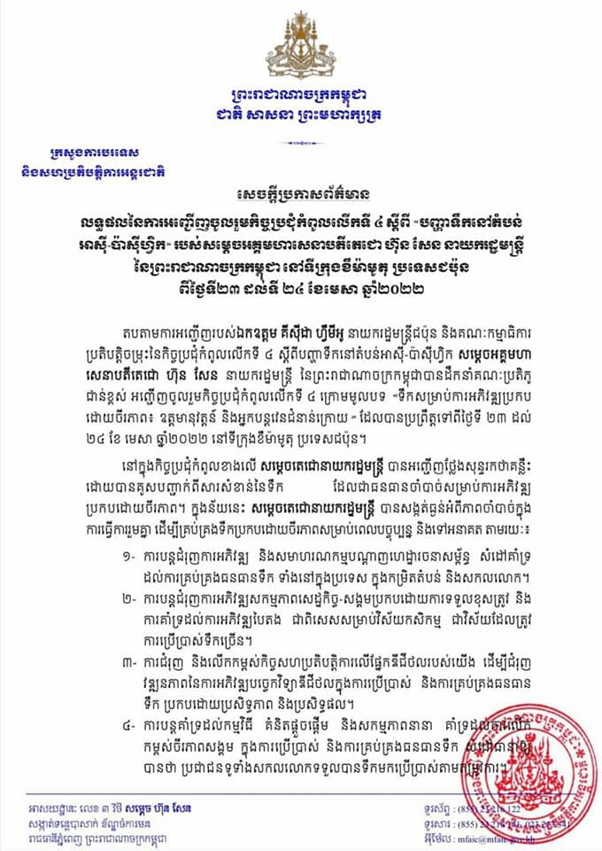 ក្រសួងការបរទេស បង្ហាញលទ្ធផលនៃការអញ្ជើញចូលរួមកិច្ចប្រជុំកំពូលលើកទី ៤ ស្តីពី «បញ្ហាទឹកនៅតំបន់អាស៊ី- ប៉ាស៊ីហ្វិក»