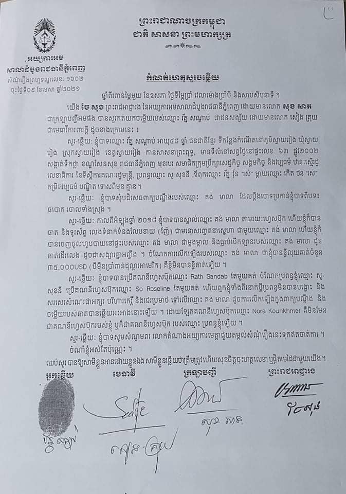 នៅក្នុងចម្លើយបំភ្លឺ នៅចំពោះមុខព្រះរាជអាជ្ញារងចែ សុង កាលពី០៥ ឧសភា ២០២១ លោក រ័ត្ន សណ្តាប់ បានបដិសេធពាក្យបណ្តឹងរបស់ពាណិជ្ជករពី បទឆបោកទាំង ស្រុង ហើយក៏មិនបានខ្ចីលុយចំនួន៣៥០០០ដុល្លារអ្វីនោះដែរ។