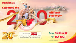 (ភ្នំពេញ) ÷ អ្នកធ្វើដំណើរមកពីប្រទេសកម្ពុជា អាចទាញយកអត្ថប្រយោជន៍ពីការផ្តល់ជូនពិសេសថ្មីរបស់ក្រុមហ៊ុន Vietjet ខណៈដែលក្រុមហ៊ុនអាកាសចរណ៍ប្រារព្ធព្រឹត្តិការណ៍ដ៏សំខាន់របស់ខ្លួន ជាមួយអ្នកដំណើរចំនួន ២០០ លាននាក់ ដោយបើកដំណើរការប្រូម៉ូសិនពិសេសរយៈពេលមួយខែ។